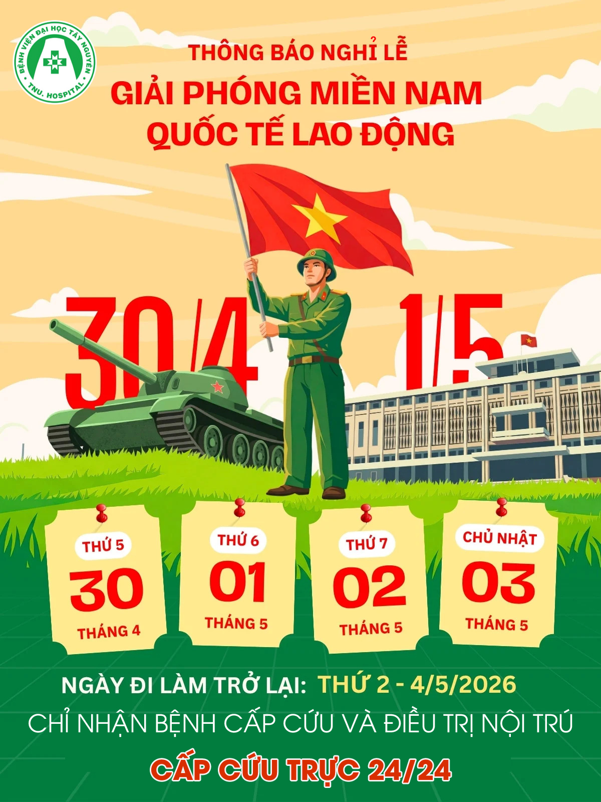 Nhân dịp lễ 30/4 – Ngày Giải phóng miền Nam và 1/5 – Ngày Quốc tế Lao động, Bệnh viện Trường Đại học Tây Nguyên xin thông báo lịch nghỉ lễ như sau: